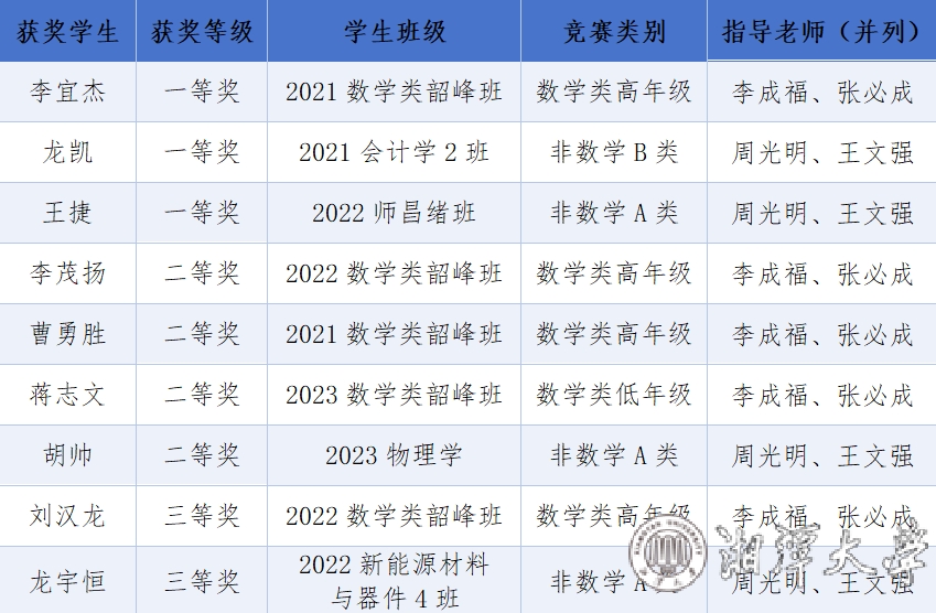 4月11日至13日,第十六屆全國大學生數學競賽決賽舉辦,我校9名參賽選手全部獲獎。獲全國一等獎3項、二等獎4項、三等獎2項。一等獎數及獲獎總數位居湖南賽區第一,這是我校連續四屆榮獲該賽事一等獎。