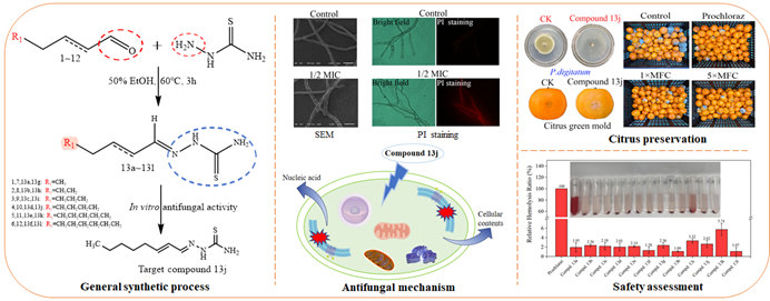柑橘是我國(guó)第一大水果,柑橘產(chǎn)業(yè)的健康發(fā)展對(duì)推動(dòng)湖南省鄉(xiāng)村振興意義重大。柑橘果蔬貯藏和運(yùn)輸過(guò)程中,易遭受多種侵染性病害影響,造成嚴(yán)重經(jīng)濟(jì)損失。常用的化學(xué)殺菌劑極易導(dǎo)致病原菌出現(xiàn)耐藥性,造成防治效果下降或喪失,尋找可商業(yè)化植物源殺菌劑是柑橘產(chǎn)業(yè)亟待解決的關(guān)鍵問(wèn)題之一。本研究以典型植物精油抑菌組分為基礎(chǔ),通過(guò)縮合反應(yīng)獲得12種硫代酰胺類(lèi)化合物,該類(lèi)型化合物克服了植物精油水溶性差等問(wèn)題,其中化合物13j殺菌活性與常規(guī)化學(xué)殺菌劑咪鮮胺持平,但毒性遠(yuǎn)低于咪鮮胺,且對(duì)柑橘咪鮮胺耐藥性菌株保持更強(qiáng)殺菌活性,完全具備商業(yè)化學(xué)殺菌劑的應(yīng)用潛力,能有效突破果蔬類(lèi)綠色殺菌劑受制于國(guó)外的“卡脖子”問(wèn)題,相關(guān)技術(shù)已申請(qǐng)國(guó)家發(fā)明專(zhuān)利。