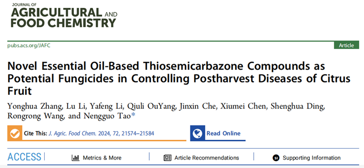 近日,我校陶能?chē)?guó)教授團(tuán)隊(duì)與湖南省農(nóng)業(yè)科學(xué)院丁勝華研究員、湖南農(nóng)業(yè)大學(xué)王蓉蓉副教授合作,在國(guó)際權(quán)威期刊《農(nóng)業(yè)與食品化學(xué)》雜志(Journal of Agricultural and Food Chemistry,中科院農(nóng)林科學(xué)1區(qū)Top,IF=5.7))發(fā)表研究論文《基于精油的新型硫代酰胺化合物作為柑橘采后病害防控的潛在殺菌劑》(Novel Essential Oil-Based Thiosemicarbazone Compounds as Potential Fungicides in Controlling Postharvest Diseases of Citrus Fruit)。我校化工學(xué)院2020級(jí)化學(xué)工程與技術(shù)專(zhuān)業(yè)博士生張永華為論文第一作者,陶能?chē)?guó)教授為論文通訊作者。